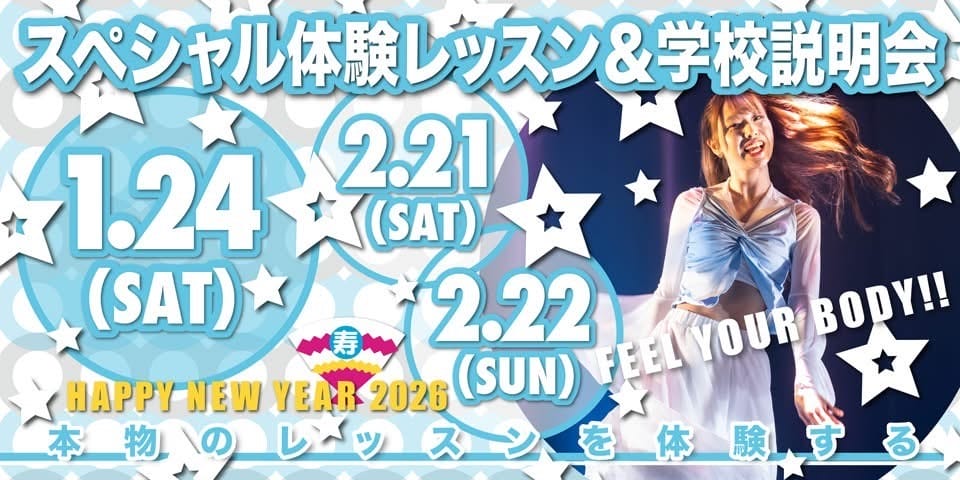 日程:2026年1月24日(土)/2月21日(土)/2月22日(日) レッスン内容: 東京ステップスアーツレギュラー講師による、プロになるためのレッスンを用意! ダンスや歌は好きだけどプロになるにはどうしたらいいんだろう…そんな悩みを一気に解消!「体験レッスン&学校説明会」に参加してみよう!!レッスン詳細はオフィシャルサイトをチェック!!